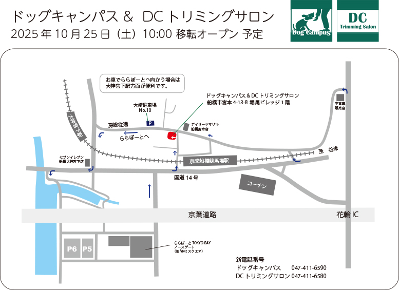 移転先は京成線船橋競馬場駅徒歩1分の立地です。DCトリミングサロンも併設し、2025年10月25日オープンの予定です。